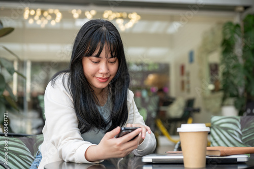 woman, sitting, outdoors, outside, asian, female, young, lifestyle, modern, casual attire, table, desk, cafes, cafes, cafeteria, eatery, student, business, businesswoman, using, smartphone, mobile, phone, mobile phone, device, technology, wireless, connection, network, chat, message, shopping, app, application, communication, photo, relaxation, holding, cyberspace, watching, looking, lunch, happy, positive