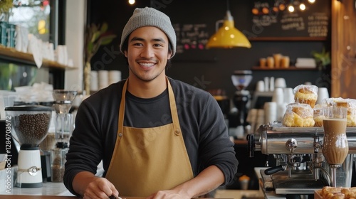 barista, hot drink, shop, young, indigenous, male, portrait, smiling, casual attire, hoodie, beanie, beverage, espresso, service, friendly, workplace, accessory, youth, artisan, cafes, warm, inviting, counter, drink, culture, community, hospitality, professional, equipment, aesthetic, cheerful, preparation, brew, work, daily, lifestyle, dining, trendy, modern, fashion, youth culture, atmosphere