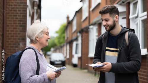 A young man and an elderly woman engage in a friendly conversation on a residential street, exemplifying community connection.