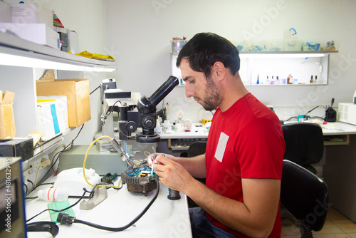 microscope, man, workshop, electrical equipment, manufacturing, machine-building, people, electric motor, electric wire, laboratory, lense, micro, magnification, work, technology, management, brunette, tabletop, desktop, scalpel, screwdriver, business, workflow, experiment, research