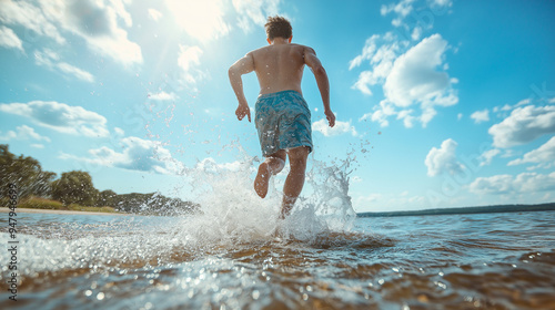 A young man running in water on a sunny summer day and wearing shorts and the the water is splashing into air, significantly ocean leisure activity concept