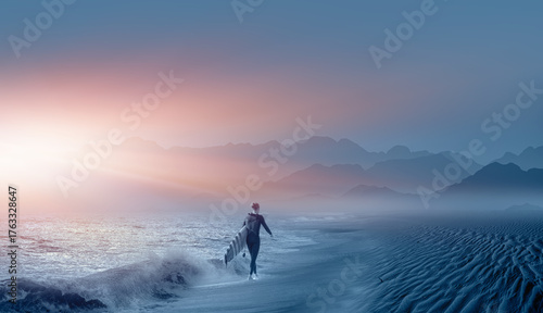 A Young man surfer walks on the beach with a surfboard in hand - Namib desert with Atlantic ocean meets near Skeleton coast - Namibia, South Africa