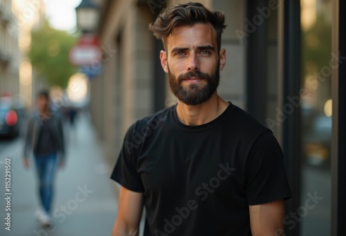 man, young, beard, city street, urban, fashion, casual attire, model, photogenic, portrait, outdoors, daytime, cool, confident, trendy, stylish, attractive, coiffure, eye, face, expression, serious, city landscape, background, people, blurry, out of focus, lifestyle, men's fashion, grooming