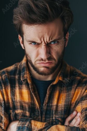 A young man with a serious expression, wearing a plaid shirt, crossing his arms. He has tousled hair and striking blue eyes, set against a dark background.