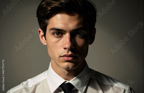 young, man, male, portrait, formal, professional, serious, confident, attire, white, shirt, black, attaching, dark, hair, fair, skin, indoor, lighting, head shot, fashion, style, adult, photogenic, expression, background, studio, close, up, model, elegance, sophistication, business, corporate, confidence, modern, clean, minimalistic