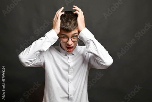 a young man with glasses, holding his head in his hands, with his eyes closed, screaming in pain and anger. Studio photo, on a gray background.