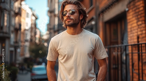 A young man with long brown hair and a beard, wearing sunglasses and a light beige t-shirt, stands pensively on a city street. The urban backdrop is slightly blurred