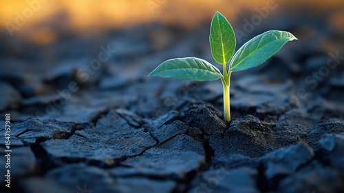 A young plant emerges from cracked soil, showcasing new - life and growth. The vibrant green leaves contrast with the dark earth, set against a softly blurred, warm - toned background