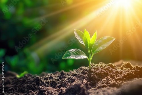A young plant thrives and flourishes under the warm rays of sunlight.