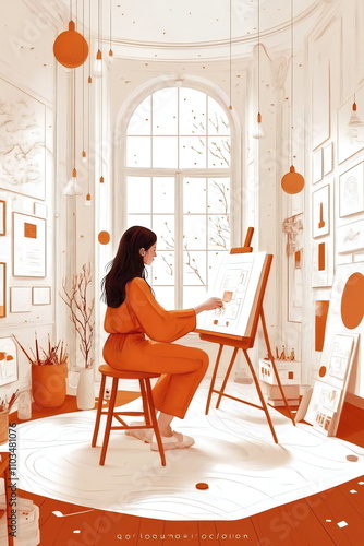 A young woman, dressed in orange, sits at an easel in a bright, airy studio, lost in the process of creating art. The soft orange and white color palette creates a calm and peaceful atmosphere.