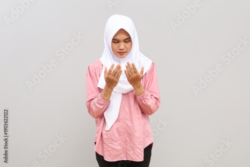 asian, indonesian, arabian, woman, female, ramadan, veiled, woman, muslim, muslim, islam, islamic, isolated, background, young, wearing, headscarf, religion, raising, both, hand, praying, gesture, open, palm, grey, spiritual, spirituality, prayer, religious, god, holy, pray, looking, worship, portrait, posing, standing, concept, hope, concentration, belief, peaceful, down, closed