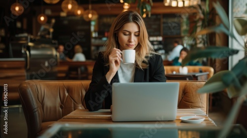 A young woman is seated at a modern desk, using a sleek laptop