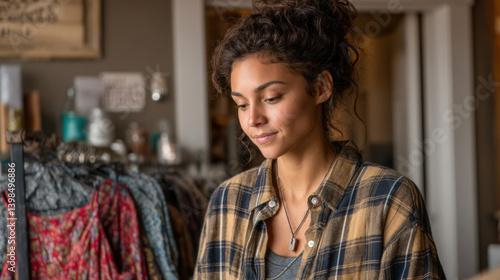 A young woman of mixed ethnicity with curly hair, wearing a plaid shirt, looks thoughtfully at her work in a cozy, fashion boutique filled with vibrant clothing