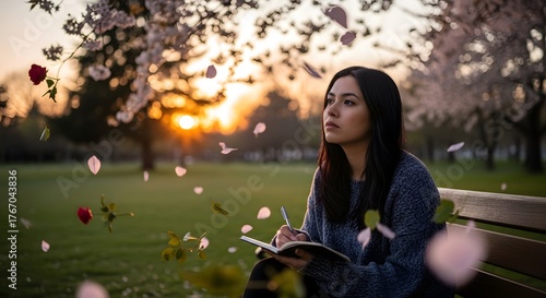 woman, journal, writing, sunset, flower petals, bench, park, spring, outdoors, nature, relaxation, contemplation, peaceful, serene, thoughtful, daydreaming, inspiration, creativity, notebook, pen, tree, lawn, grass, scenic, twilight, golden hour, soft light, dreamy, escape, quiet, mindfulness, meditation, calm, harmony, landscape, beauty, seasonal, floral, cherry blossom, blossom, romantic, leisure, solitude, portrait, lifestyle