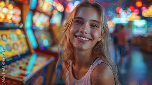 girl, smile, arcade, game, joy, entertainment, colourful, fun, laughter, youth, light, playful, happiness, expression, vibrant, leisure, activity, friends, amusement, excitement, casual attire, atmosphere, indoor, technology, nostalgia, social, interaction, portrait, candid, gaming, enjoyment, thrill, energy, community, youthfulness, cheerful, dynamic, lively, life events, ambience, carefree