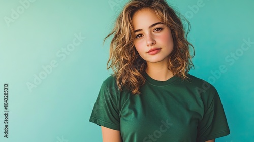 individual, serene, relaxed, pose, movement, joyful, warmth, confidence, youth, glow, vibrant, photo, trend, emotion, chic, everyday, personality, model, expression, colours, smile, artistic, shirt, aesthetic, charme, ambience, teal, artistry, appearance, curly, candid, hair, portrait, woman, modern, girl, character, lifestyle, style, fashion, creative, beauty, casual attire, green, vibe, accessory, background, natural