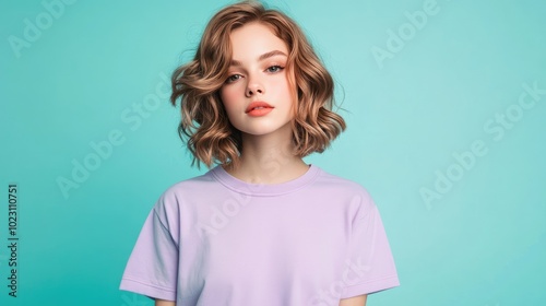 A young woman with stylish wavy hair poses confidently against a bright turquoise background, wearing a casual purple t-shirt.