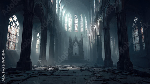 Abandoned ancient chapel with tall windows concept. Mystical interior of an abandoned gothic cathedral with sunlight.