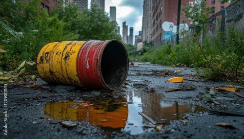 barrel, urban, alleyway, rust-eaten, metal, yellow, red, decay, abandoned, city landscape, industrial, grunge, pollution, waste, garbage, litter, debris, puddle, wet, ground, asphalt, street, building, city, background, weed, overgrown, plant, nature, contrast, texture, dark, shadow, grey, water, environment, daytime, outside