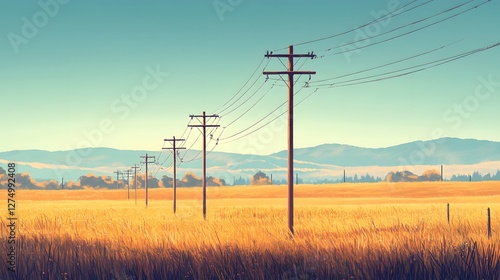 industry, field, calmness, countryside, scenery, nostalgia, sunshine, gold, golden yellow, hill, stillness, scarecrow, dawn, windmill, powerline, emptiness, blue skies, white cloud, time