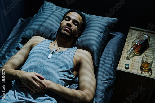 Above view of young man lying on bed with bottle of whisky on night table and suffering from insomnia after traumatic event