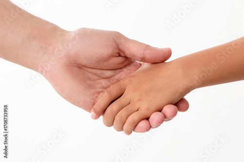 Absolute Trust And Support. Cropped close up of man and girl holding hands, enjoying spending free time together, isolated over white studio background. Assistance And Children Custody Concept