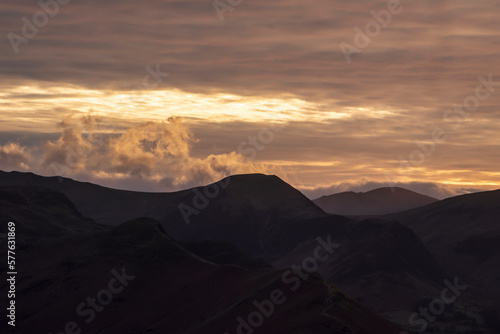 Absolutely wonderful landscape image of view across Derwentwater from Latrigg Fell in lake District during Winter beautiful colorful sunset