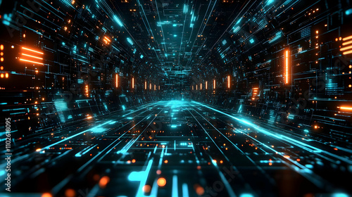futuristic, modern, cyberspace, technology, circuit, three-dimensional, blue, orange, line, graphic, digital illustration, background, light, neon light, pattern, abstract, speed, network, tunnel, art, digital artwork, neon, glowing, design, information technology, digital