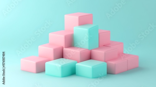 Abstract 3D render of pink and mint cubes forming a stepped pyramid