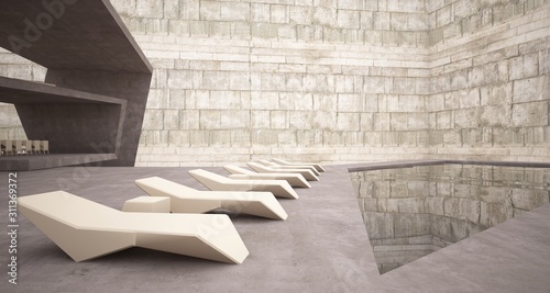 Abstract architectural concrete interior of a minimalist house with swimming pool. 3D illustration and rendering.