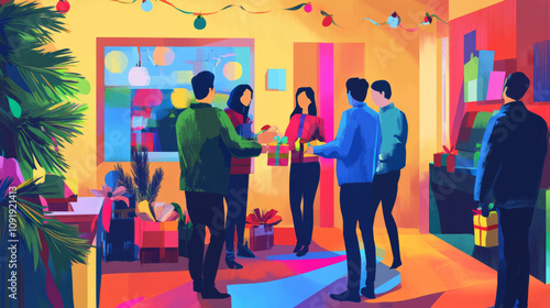 Abstract art gift exchange at office Christmas party presents gifts secret Santa holiday bright cheerful colorful positive emotion happy coworkers birthday friendship fun happy atmosphere copy space