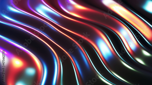 Abstract background, liquid metal waves with neon colors lights, interesting dark metallic texture 3D Render illustration.