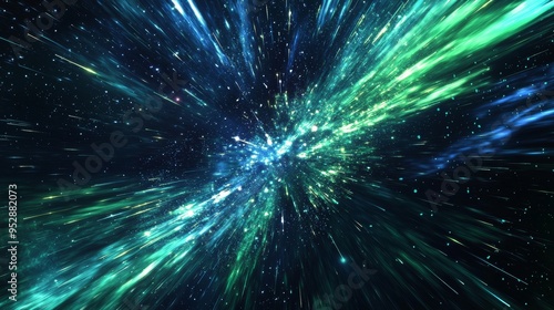 Abstract background representing a hyperspace jump through a galaxy, with green and blue lights trails and many stars. Perfect for projects related to science fiction and space exploration