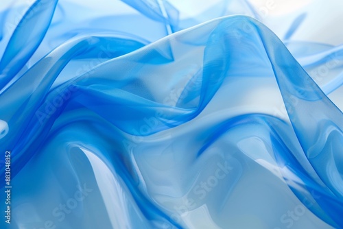Abstract background wallpaper, close-up of blue fabric, smooth and flowing in the wind, against a white background. The focus is on capturing the texture and softness of the material. curves folds