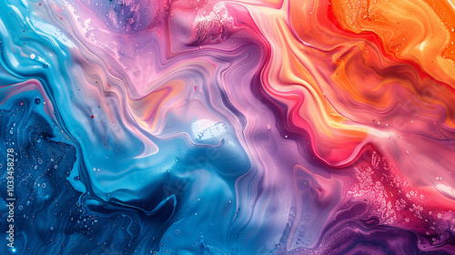Abstract background with colorful paint swirls and fluid shapes, creating an artistic texture. High-resolution photography capturing the vibrant colors of acrylic paints on canvas.