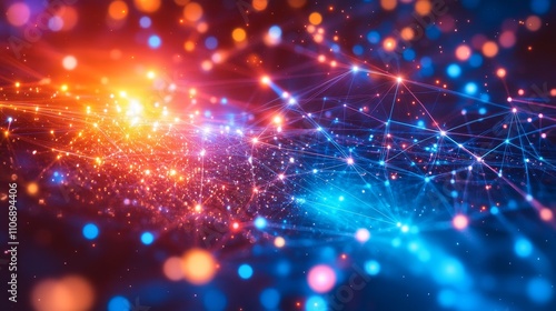 Abstract background with glowing particles in red, orange and blue hues