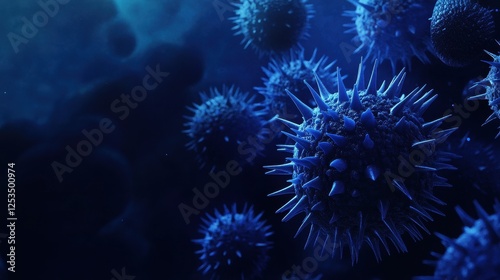 Abstract banner featuring a close-up of spherical blue viruses with spikes, illuminated against a dark blue gradient background and space for copy.