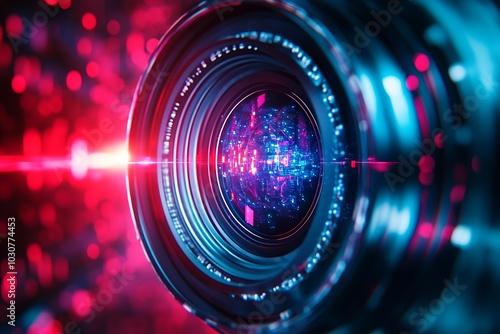 Abstract Camera Lens Glare with Digital Pattern and Red Highlights.