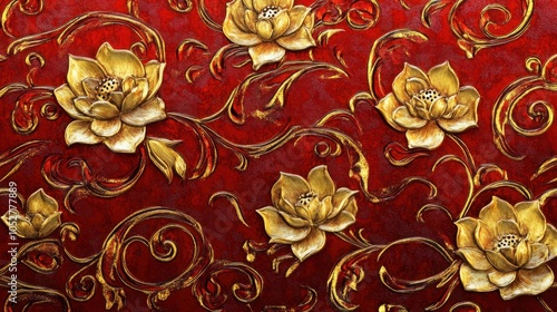 Abstract Chinese design with golden lotus motifs on vibrant red, creating a luxurious, traditional look, isolated on white