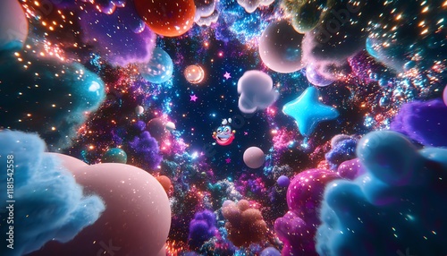 Abstract colorful 3D render of glowing spheres and sparkling particles in a vibrant cosmic scene. Perfect for fantasy, sci-fi, or whimsical backgrounds.