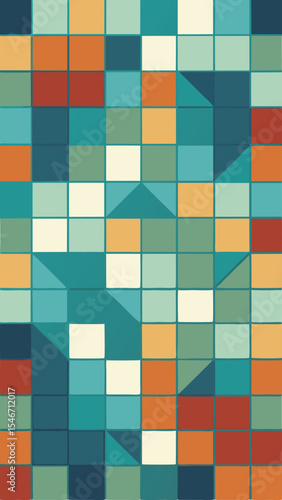 abstract, background, pattern, geometric, tile, colourful, design, illustration, vector, texture, graphic, art, seamless, mosaic, grid, square, block, shape, modern, contemporary, trendy, creative, minimalist, digital, wallpaper, surface, vibrant, retro, vintage, artistic, style, teal, orange, red, blue, green, transparency, on white, editable, versatile
