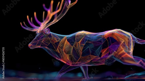 cervid, animal, running, abstract, geometric, colourful, line, shape, polygonal, motion, energy, graphic, design, illustration, digital, artwork, contemporary, vibrant, polygon, creative, graphic design, vector, isolated, many-coloured, abstract art, wildlife, mammal, antler, pattern, modern, digital artwork, background, black, copy space