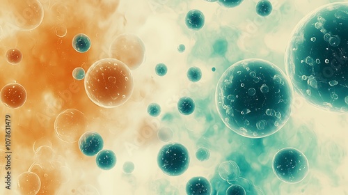 Abstract Design of Colorful Spheres Surrounded by Soft Textures and Vivid Hues of Orange and Blue, Representing Science and Modern Art Concepts