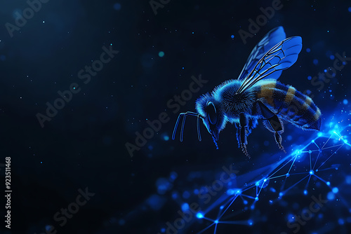 Abstract digital background banner featuring a bee and part of an arm with data connection elements in blue and black colors