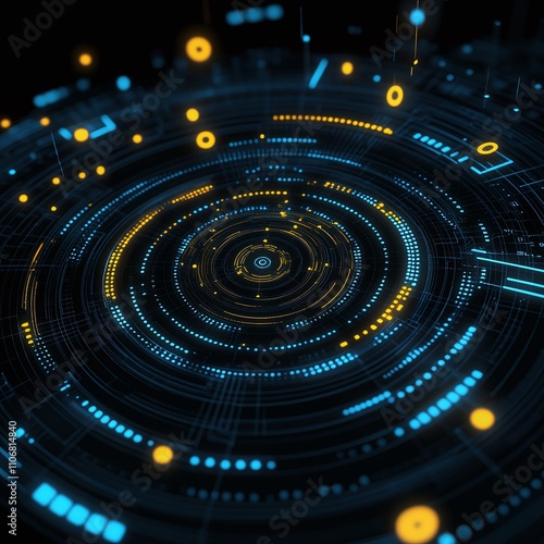 Abstract Digital Background with Circular Patterns and Glowing Elements in Blue and Yellow Colors
