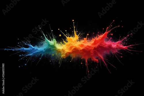 Abstract digital illustration on black background dissolving into splashes of rainbow color