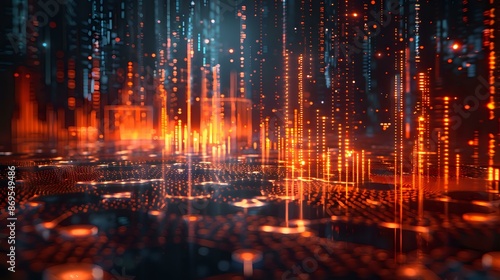 Abstract digital landscape with glowing orange and blue lines, ideal for technology-themed projects, digital art, and futuristic designs.