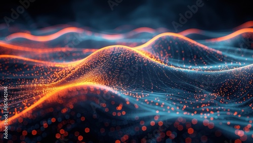 digital, landscape, abstract, particle, glowing, swirling, line, orange, blue, futuristic, scene, technology, datum, network, connection, wave, pattern, texture, design, graphic, art, background, dark, light, colours, gradient, blur, motion, dynamic, energy, modern, minimalism, concept, style, high-coloured, sparkle