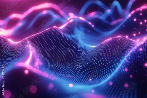 Abstract digital landscape with neon pink and blue glowing lights effects