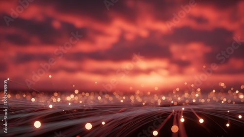 sunset, digital, network, abstract, technology, crimson, sky, cloud, dawn, dusk, twilight, light, glow, bokeh, particle, connection, datum, energy, futuristic, motion, flow, line, thread, spark, bright, shine, aethereal, dreamy, science, modern, vibrant, intense, wonder, imagination, conceptual, background, pattern, design, graphic, blur, blurry, depth, field, red, orange, atmospheric, dramatic, wire
